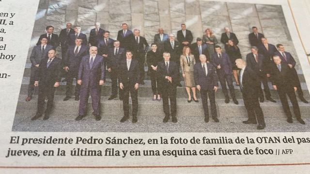 The first is the NATO meeting in Brussels of April this year with the below family photo from a Spanish newspaper that may have a hidden message about how the United States views Spain as an ally: